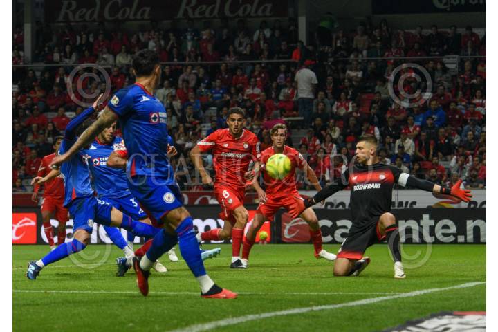 Tiago Volpi portero de los Diablos de Toluca y Gonzalo Carneiro delantero del Cruz Azul durante el encuentro de la jornada 6 del Torneo Clausura 2023 de la Liga MX.