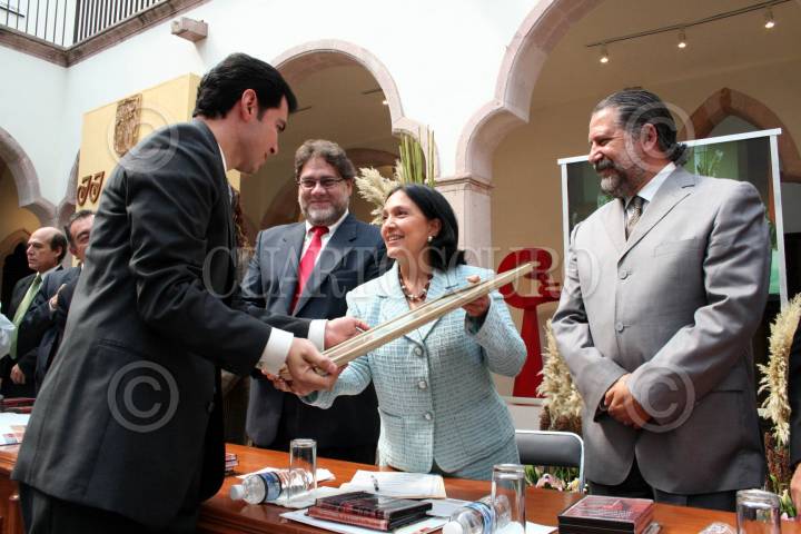 ZACATECAS, ZACATECAS. 27OCTUBRE2006.- Amalia García Medina inauguró la II Feria de las Ciudades Mexicanas del Patrimonio Muindial en el Museo Manuel Felguerez. En la imagen, Luis M. Tiburcio, representante de la UNESCO en México y Gerardo Félix Domínguez, presidente municipal de la entidad entregan un reconocimiento al diputado Rafael Flores Mendoza. FOTO: PAOLA HIDALGO/CUARTOSCURO.COM