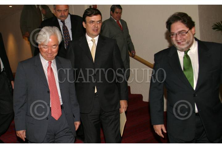 MEXICO, D.F. 22ENERO2007.- Axel Didricksson, Marcelo Ebrard Casaubom, jefe de gobierno de la ciudad de México conversa con Axel Didriksson durante y Luis Tiburcio, representante de la ONU a su llegada al Seminario Realizado por la UNESCO, Tema la Educación. FOTO: NELLY SALAS/CUARTOSCURO.COM