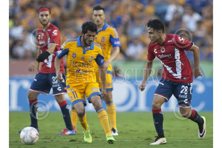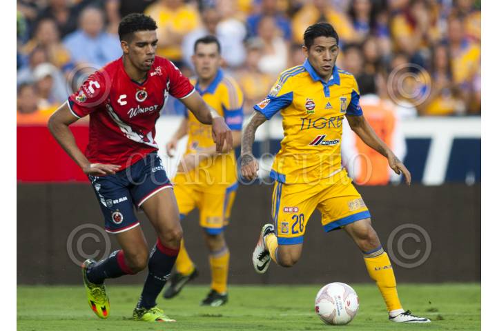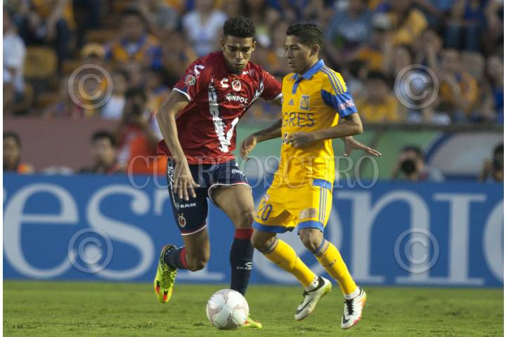 MONTERREY, NUEVO LEÓN, 30ABRIL2016.- Javier Aquino del equipo de los Tigres de la UANL, se disputa el balón con Daniel Villalva del equipo de los Tiburones Rojos del Veracrúz, en el estadio Universitario, partido correspondiente a la jornada 16 de la Liga MX, Clausura 2016. Marcador Final: Tigres: 0- Veracrúz: 0. FOTO: GABRIELA PÉREZ MONTIEL / CUARTOSCURO.COM