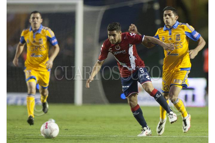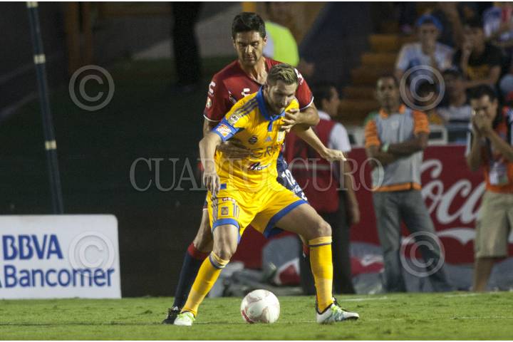 MONTERREY, NUEVO LEÓN, 30ABRIL2016.- Javier Aquino del equipo de los Tigres de la UANL, se disputa el balón con Carlos Andrés Calvo del equipo de los Tiburones Rojos del Veracrúz, en el estadio Universitario, partido correspondiente a la jornada 16 de la Liga MX, Clausura 2016. Marcador Final: Tigres: 0- Veracrúz: 0. FOTO: GABRIELA PÉREZ MONTIEL / CUARTOSCURO.COM