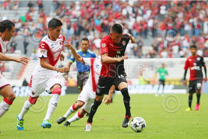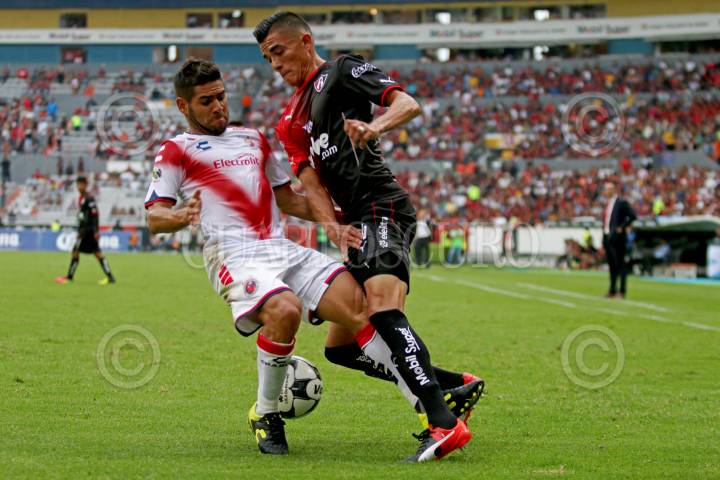 GUADALAJARA, JALISCO, 30JULIO2016.- Luis Reyes, jugador de Atlas, disputa un balón a Daniel Villalba de Veracruz en partido correspondiente a la Jornada 3 del Torneo Apertura2016 de la Liga MX, en donde se enfrentan los Zorros del Atlas frente a los Tiburones Rojos de Veracruz, en partido que se juega en el estadio Jalisco. FOTO : FERNANDO CARRANZA GARCIA / CUARTOSCURO.COM