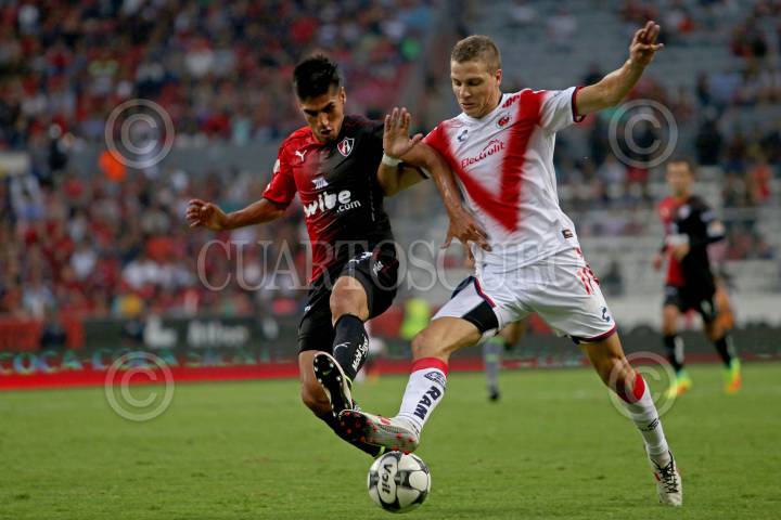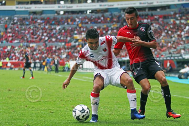 GUADALAJARA, JALISCO, 30JULIO2016.- Daniel Alvarez, jugador de Atlas, disputa un balón a Daniel Villalba de Veracruz en partido correspondiente a la Jornada 3 del Torneo Apertura2016 de la Liga MX, en donde se enfrentan los Zorros del Atlas frente a los Tiburones Rojos de Veracruz, en partido que se juega en el estadio Jalisco. FOTO : FERNANDO CARRANZA GARCIA / CUARTOSCURO.COM