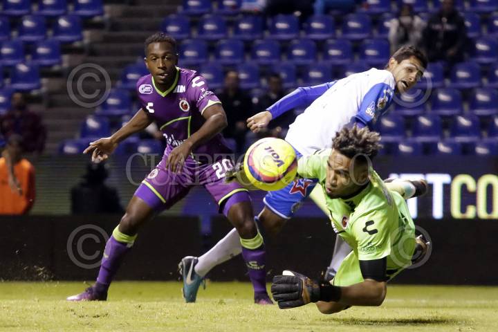 PUEBLA, PUEBLA, 19ENERO2018.- El portero del Veracruz; Pedro Gallese evita la anotación durante jugada del partido correspondiente a la jornada 3 del clausura 2018 de la Liga MX celebrado en el estadio Cuauhtémoc, con marcador final 2-0 a favor de los locales. FOTO: HILDA RÍOS/CUARTOSCURO.COM