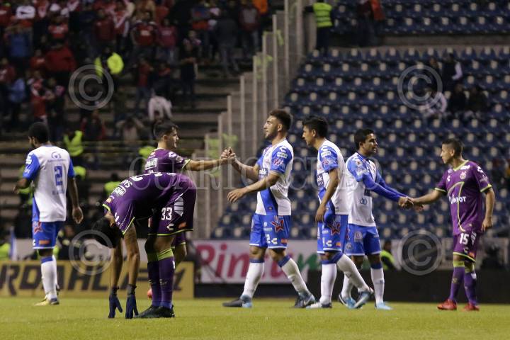 PUEBLA, PUEBLA, 19ENERO2018.- Los jugadores Alejandro Chumacero y Alan Santos disputan el balón durante jugada del partido correspondiente a la jornada 3 del clausura 2018 de la Liga MX celebrado en el estadio Cuauhtémoc, con marcador final 2-0 a favor de los locales. FOTO: HILDA RÍOS/CUARTOSCURO.COM
