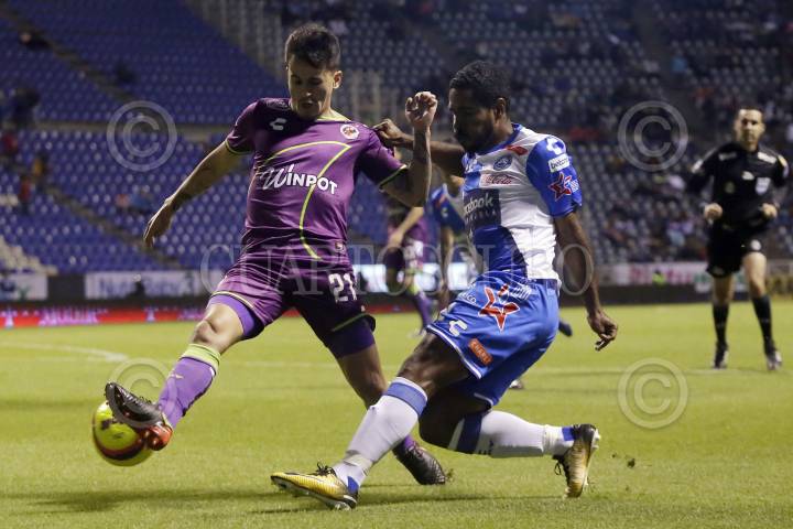 PUEBLA, PUEBLA, 19ENERO2018.- Los jugadores Adrián Luna y Félix Micolta, disputan el balón durante jugada del partido correspondiente a la jornada 3 del clausura 2018 de la Liga MX celebrado en el estadio Cuauhtémoc, con marcador final 2-0 a favor de los locales. FOTO: HILDA RÍOS/CUARTOSCURO.COM