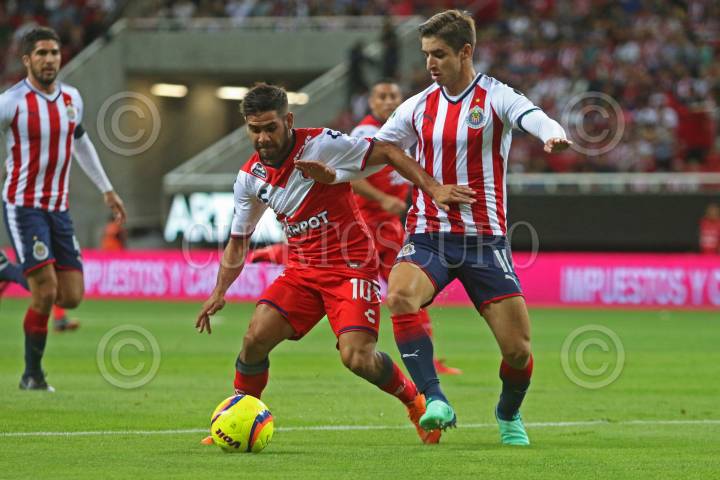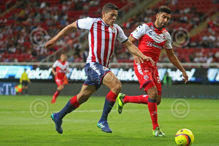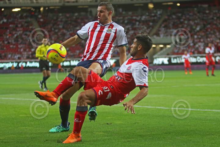 ZAPOPAN, JALISCO. 07ABRIL2018.- Jesús Godínez jugador de Chivas disputa un balón a José Rivas de Veracruz, en partido correspondiente a la Jornada 14 del Torneo Clausura 2018, en donde se enfrentan las Chivas de Guadalajara frente a los Tiburones Rojos del Veracruz, en partido que se lleva a cabo en el Estadio Akron. FOTO: FERNANDO CARRANZA GARCIA / CUARTOSCURO.COM