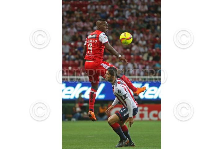 ZAPOPAN, JALISCO. 07ABRIL2018.- Jair Pereira jugador de Chivas disputa un balón a José Rivas de Veracruz, en partido correspondiente a la Jornada 14 del Torneo Clausura 2018, en donde se enfrentan las Chivas de Guadalajara frente a los Tiburones Rojos del Veracruz, en partido que se lleva a cabo en el Estadio Akron. FOTO: FERNANDO CARRANZA GARCIA / CUARTOSCURO.COM
