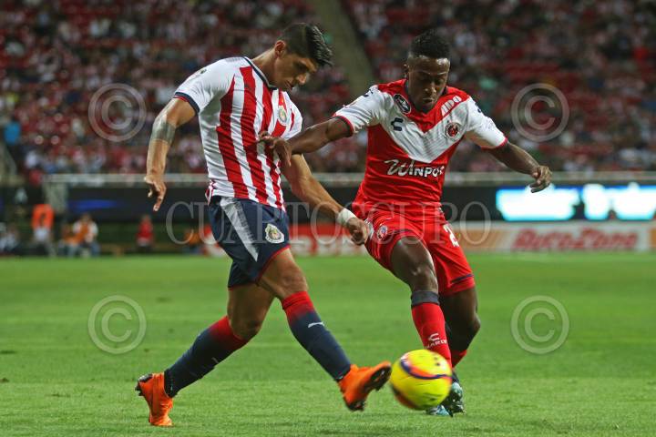ZAPOPAN, JALISCO. 07ABRIL2018.- Daniel Villalva jugador de Veracruz disputa un balón a Alejandro Mayorga de Chivas, en partido correspondiente a la Jornada 14 del Torneo Clausura 2018, en donde se enfrentan las Chivas de Guadalajara frente a los Tiburones Rojos del Veracruz, en partido que se lleva a cabo en el Estadio Akron. FOTO: FERNANDO CARRANZA GARCIA / CUARTOSCURO.COM