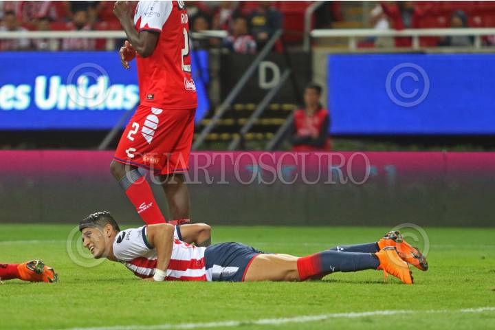ZAPOPAN, JALISCO. 07ABRIL2018.- Edson Torres jugador de Chivas se lamenta por las fallas, en partido correspondiente a la Jornada 14 del Torneo Clausura 2018, en donde se enfrentan las Chivas de Guadalajara frente a los Tiburones Rojos del Veracruz, en partido que se lleva a cabo en el Estadio Akron. El marcador al final del encuentro fue de 1-0 a favor del equipo visitante. FOTO: FERNANDO CARRANZA GARCIA / CUARTOSCURO.COM