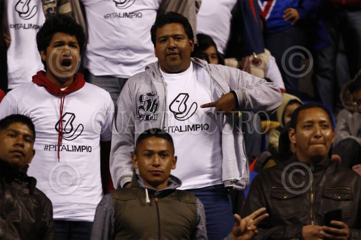 PUEBLA, PUEBLA, 23ENERO2016.- Aficionados del Veracruz portan playeras con la leyenda "Pita Limpio" durante el partido entre los Tiburones de Veracruz y los Jaguares de Chiapas correspondiente a la jornada 3 del torneo de Clausura 2016 de la liga de futbol MX celebrado en el estadio Cuahutémoc. FOTO: HILDA RÍOS /CUARTOSCURO.COM