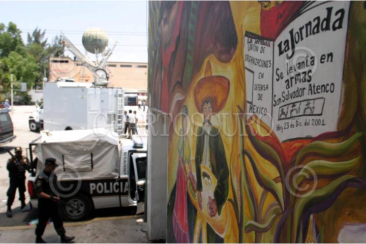 SAN SALVADOR ATENCO, EDOMEX, 04MAYO2006.- El mural que se encuentra en el auditorio Emiliano Zapata, uno de los puntos de reunión del Frente de Pueblos para la Defensa de la Tierra. Por la mañana fueron desalojados unos presuntos participantes de la trifulca entre comuneros de Atenco y la Policia Estatal. FOTO: Moisés Pablo/CUARTOSCURO.COM