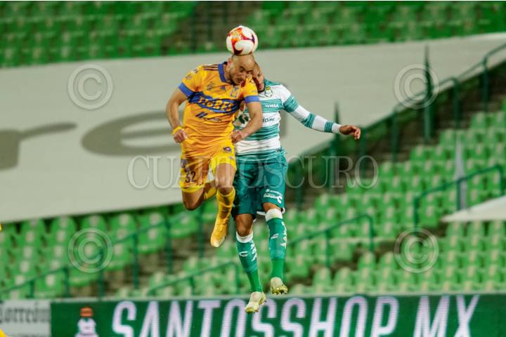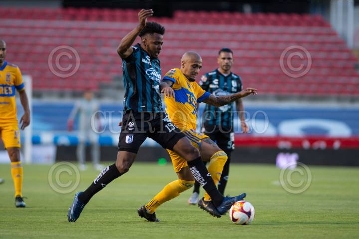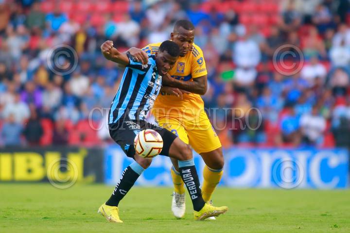 Los Gallos Blancos del Querétaro empataron a cero goles con los Tigres de la UANL. En la imagen José Zúñiga (Querétaro) y Samir Sousa (Tigres) se disputan el esférico.