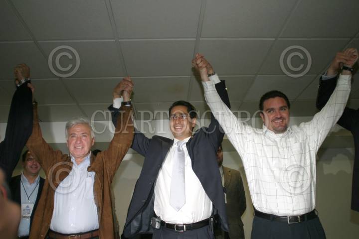 MEXICO, D.F. 29ENERO2006.- Demetrio Sodi de la Tijera, candidato electo del PAN para jefe de gobierno de la ciudad de México, Carlos Gelista, presidente del PAN del D.F. y Ferderico Dôring, candidato electo al senado de la República, levantan los brazos al darse a conocer los resultados de la jornada interna de dicho partido. FOTO: Nelly Salas/CUARTOSCURO.COM