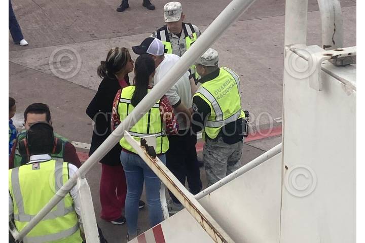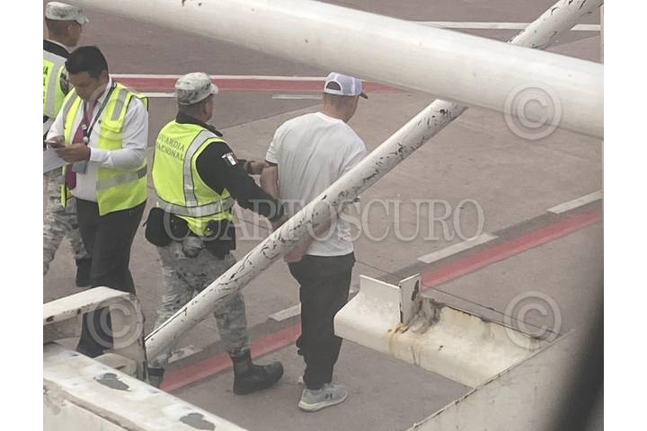 TIJUANA, BAJA CALIFORNIA, 08DICIEMBRE2024.- El que intentó secuestrar el avión siendo detenido por autoridades. Los pasajeros del vuelo Bajío-Tijuana de Volaris qué sufrió un intento de secuestro por parte de uno de sus pasajeros, llegaron sanos y salvos al Aeropuerto Internacional de Tijuana, la tarde de este domingo 8 de diciembre. Tras vivir momentos de terror, Jesús tuvo el valor de interceptar al sujeto que con una pluma tomó de rehén a la aeromoza para exigir que cambiarán el rumbo del avión con dirección a San Diego. Jesús compartió que pudo controlar la situación y hablar con el muchacho para qué se entregará pacíficamente. "Lo que yo supe por medio de él, fue que estaba huyendo del narcotráfico y buscaba protección en Estados Unidos, además viajaba con sus 2 hijos y su esposa", expresó Jesús. Por su parte, Gerardo González compartió que tuvo una muy mala experiencia y sintió en riesgo su seguridad. "Él quería llegar al aeropuerto de San Diego porque iba a pedir asilo político, entonces la aeromoza le dijo que si íbamos a aterrizar en San Diego, pero en realidad aterrizamos en Guadalajara, él era de Guanajuato y que había recibido muchas amenazas del cartel de allá", expresó Gerardo. FOTO: LUIS BAUTISA/ CUARTOSCURO.COM