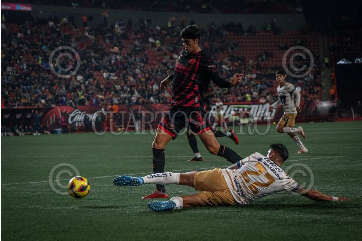 TIJUANA BAJA CALIFORNIA 25FEBRERO2025.-Ramiro Francos e Xolos y Robert Ergas del equipo de Pumas. Xolos de Tijuana rompió su racha negativa de cinco partidos perdidos consecutivos en el Torneo Clausura 2025 al golear 4-2 a Pumas en el Estadio Caliente. Con una destacada y sólida actuación, el equipo dirigido por Juan Carlos Osorio se impuso ante su afición, logrando una victoria que les da un respiro tras un mal paso en el campeonato. Con este contundente triunfo, los Xolos suman 7 puntos tras 9 jornadas disputadas, y aunque la situación aún es complicada, la victoria les permite mantener la esperanza de salir del bache en el que se encontraban. Ahora, el equipo tijuanaense pondrá su mirada en su próximo encuentro, donde se medirán ante León, un rival complicado. Xolos buscará aprovechar la oportunidad para dar un golpe sobre la mesa y seguir sumando puntos en su lucha por mejorar su posición en la tabla. FOTO: CHRIS NOYOLA /CUARTOSCURO.COM