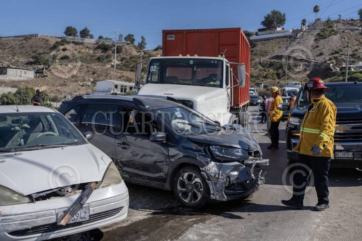 TIJUANA, BAJA CALIFORNIA, 10OCTUBRE2023.-Vehículos afectados tras el accidente vial en el que un tractocamión se quedó sin frenos. Siete vehículos se vieron afectados tras el incidente causando el cierre parcial de la vialidad tras el aparatoso evento donde un carro quedó sobre el muro que divide los dos sentidos del bulevar y dos mas que fueron impactados por el tractocamión de una empresa de reciclaje. Paramédicos de la Cruz Roja y Elementos del Cuerpo de Bomberos acudieron al lugar para brindar atención medica a las víctimas, entre ellas un menor, quienes no presentaron lesiones de gravedad. FOTO: OMAR MARTÍNEZ / CUARTOSCURO.COM