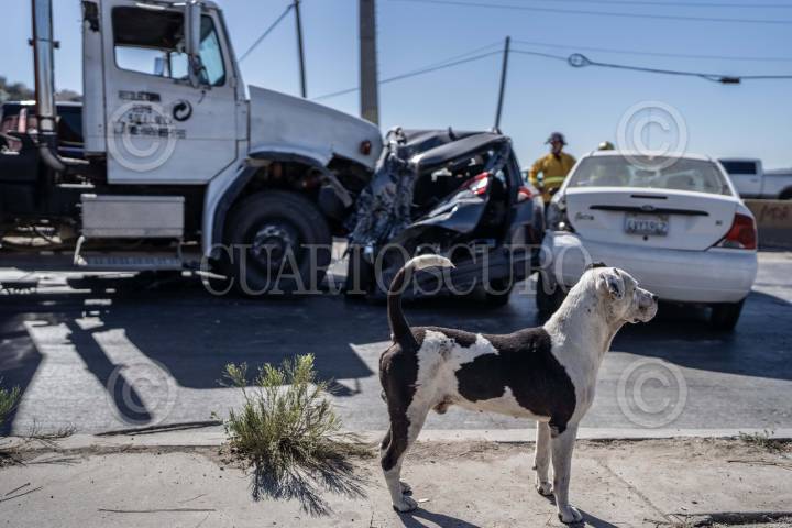 TIJUANA, BAJA CALIFORNIA, 10OCTUBRE2023.-Un tractocamión se quedó sin frenos cuando transitaba sobre el bulevar Hector Terán Terán en dirección hacia Otay. Siete vehículos se vieron afectados tras el incidente causando el cierre parcial de la vialidad tras el aparatoso evento donde un carro quedó sobre el muro que divide los dos sentidos del bulevar y dos mas que fueron impactados por el tractocamión de una empresa de reciclaje. Paramédicos de la Cruz Roja y Elementos del Cuerpo de Bomberos acudieron al lugar para brindar atención medica a las víctimas, entre ellas un menor, quienes no presentaron lesiones de gravedad. FOTO: OMAR MARTÍNEZ / CUARTOSCURO.COM
