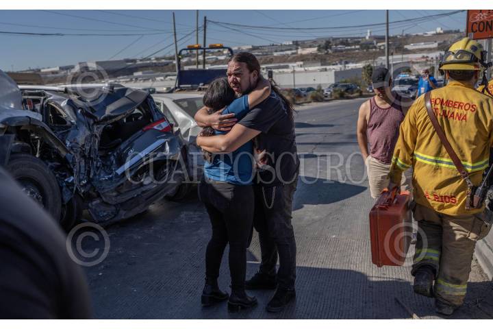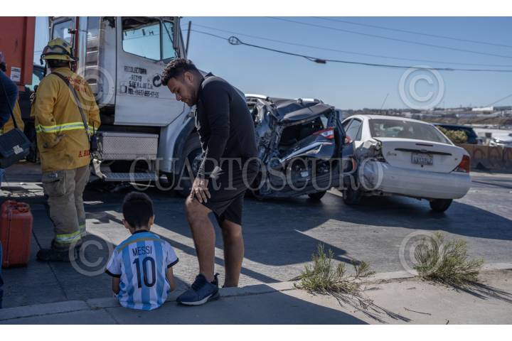 TIJUANA, BAJA CALIFORNIA, 10OCTUBRE2023.-Familiares de las personas afectadas llegaron al lugar para brindar consuelo. Siete vehículos se vieron afectados tras el incidente causando el cierre parcial de la vialidad tras el aparatoso evento donde un carro quedó sobre el muro que divide los dos sentidos del bulevar y dos mas que fueron impactados por el tractocamión de una empresa de reciclaje. Paramédicos de la Cruz Roja y Elementos del Cuerpo de Bomberos acudieron al lugar para brindar atención medica a las víctimas, entre ellas un menor, quienes no presentaron lesiones de gravedad. FOTO: OMAR MARTÍNEZ / CUARTOSCURO.COM