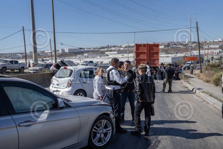 TIJUANA, BAJA CALIFORNIA, 10OCTUBRE2023.-Policía Municipal hablando con los afectados sobre el procedimiento ante los daños de su vehículo. Siete vehículos se vieron afectados tras el incidente causando el cierre parcial de la vialidad tras el aparatoso evento donde un carro quedó sobre el muro que divide los dos sentidos del bulevar y dos mas que fueron impactados por el tractocamión de una empresa de reciclaje. Paramédicos de la Cruz Roja y Elementos del Cuerpo de Bomberos acudieron al lugar para brindar atención medica a las víctimas, entre ellas un menor, quienes no presentaron lesiones de gravedad. FOTO: OMAR MARTÍNEZ / CUARTOSCURO.COM