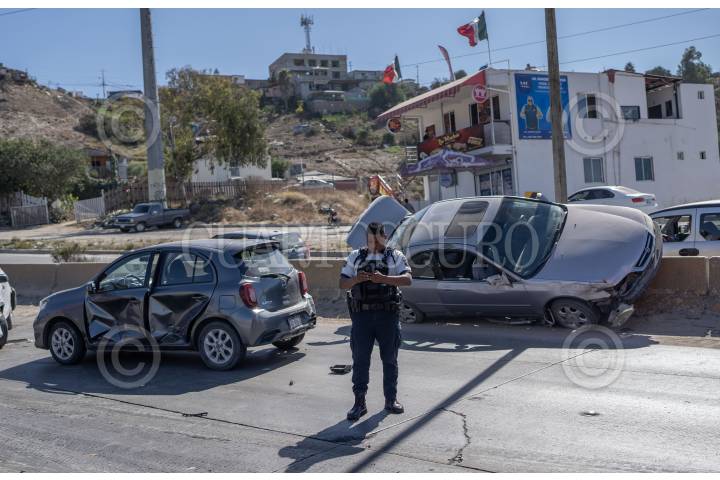 TIJUANA, BAJA CALIFORNIA, 10OCTUBRE2023.-Un menor de edad con su familiar iba a bordo de uno de los vehículos afectados. Siete vehículos se vieron afectados tras el incidente causando el cierre parcial de la vialidad tras el aparatoso evento donde un carro quedó sobre el muro que divide los dos sentidos del bulevar y dos mas que fueron impactados por el tractocamión de una empresa de reciclaje. Paramédicos de la Cruz Roja y Elementos del Cuerpo de Bomberos acudieron al lugar para brindar atención medica a las víctimas, entre ellas un menor, quienes no presentaron lesiones de gravedad. FOTO: OMAR MARTÍNEZ / CUARTOSCURO.COM