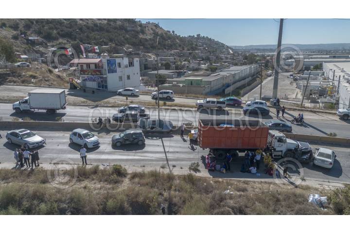 TIJUANA, BAJA CALIFORNIA, 10OCTUBRE2023.-Imagen aérea del accidente vial, donde ocho vehículos se vieron involucrados tras haberse quedo sin frenos un tractocamión sobre el bulevar Terán Terán.Un tractocamión se quedó sin frenos cuando transitaba sobre el bulevar Hector Terán Terán en dirección hacia Otay. Siete vehículos se vieron afectados tras el incidente causando el cierre parcial de la vialidad tras el aparatoso evento donde un carro quedó sobre el muro que divide los dos sentidos del bulevar y dos mas que fueron impactados por el tractocamión de una empresa de reciclaje. Paramédicos de la Cruz Roja y Elementos del Cuerpo de Bomberos acudieron al lugar para brindar atención medica a las víctimas, entre ellas un menor, quienes no presentaron lesiones de gravedad. FOTO: OMAR MARTÍNEZ / CUARTOSCURO.COM