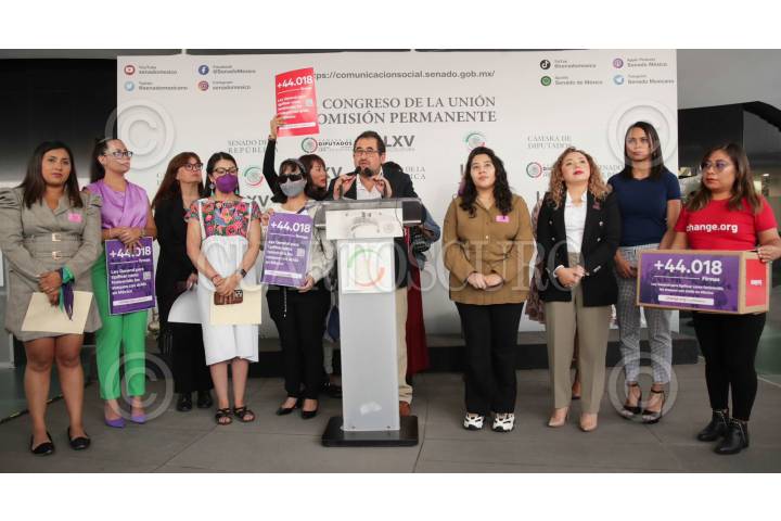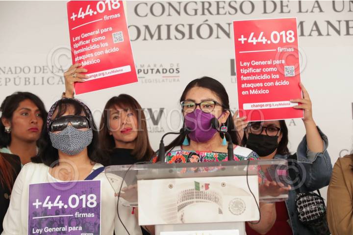 María Elena Ríos, víctima de ataque con ácido, en compañía de César Cravioto, senador de Morena, presentaron ayer en el Senado de la República la iniciativa "Ley Malena" para que se considere como intento de feminicidio los ataques con ácido contra mujeres.