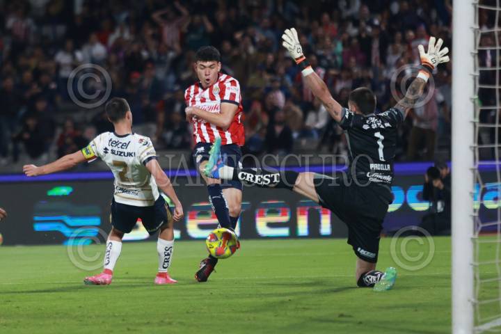 CIUDAD DE MÉXICO, 01MARZO2024. El jugador de Chivas, Luis Rey logra anotar tras la salida del portero de Pumas Alex Padilla durante el partido de fútbol Pumas vs Guadalajara correspondiente a la jornada 10 del Torneo Clausura 2025 de Liga BBVA MX, en el Estadio Olímpico Universitario. FOTO: EDGAR NEGRETE LIRA/CUARTOSCURO.COM