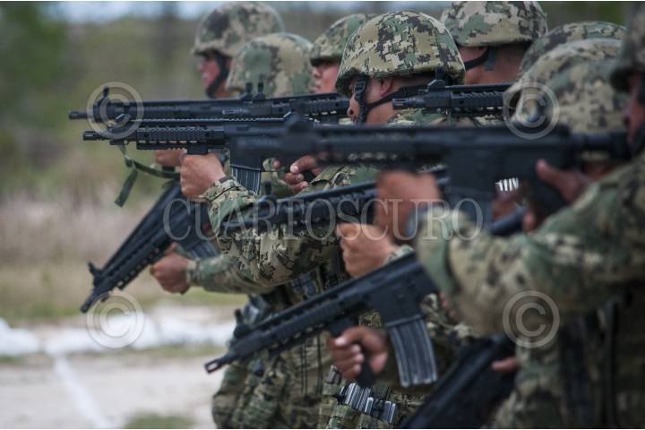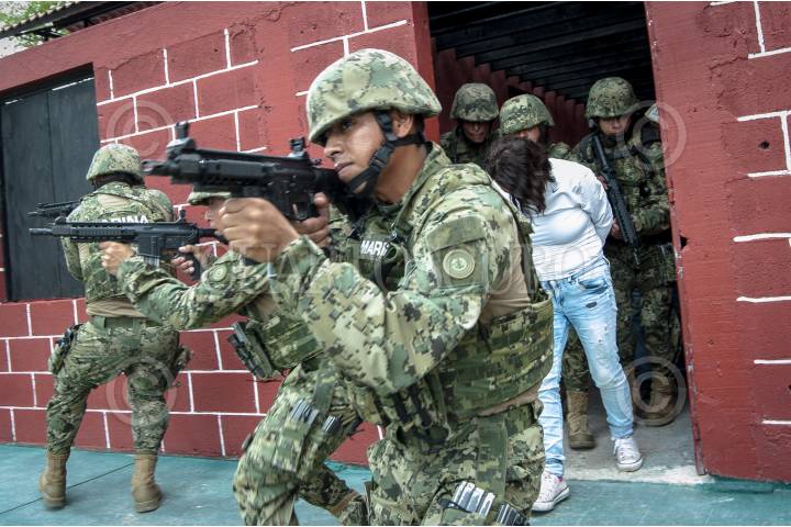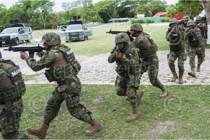 CHAMPOTÓN, CAMPECHE, 12JUNIO2016.- Elementos de la Marina Armada de México, realizan diversas prácticas y simulacros como el rescate de personas secuestradas, una emboscada, tiro con armas cortas y largas, entre otras tácticas, en el centro de capacitación y adiestramiento especializado de Infantería de Marina, ubicado en la ex hacienda de San Luis Carpizo, con una extensión de 300 hectáreas, esto como parte de un curso para periodistas que ofreció la SEMAR, titulado Operación Timonel. FOTO: DIEGO SIMÓN SÁNCHEZ /CUARTOSCURO.COM