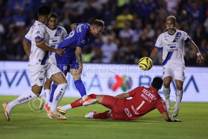 CIUDAD DE MÉXICO, 05OCTUBRE2024. Alexis Gutiérrez de la Máquina Celeste enfrenta al portero Luis Unsain de los Hidrorayos al que vence para anotar el primer tanto del partido de fútbol Cruz Azul vs Necaxa correspondiente a la jornada 11 del Torneo Apertura 2024 de Liga BBVA MX, en el Estadio Ciudad de los Deportes. FOTO: EDGAR NEGRETE LIRA/CUARTOSCURO.COM