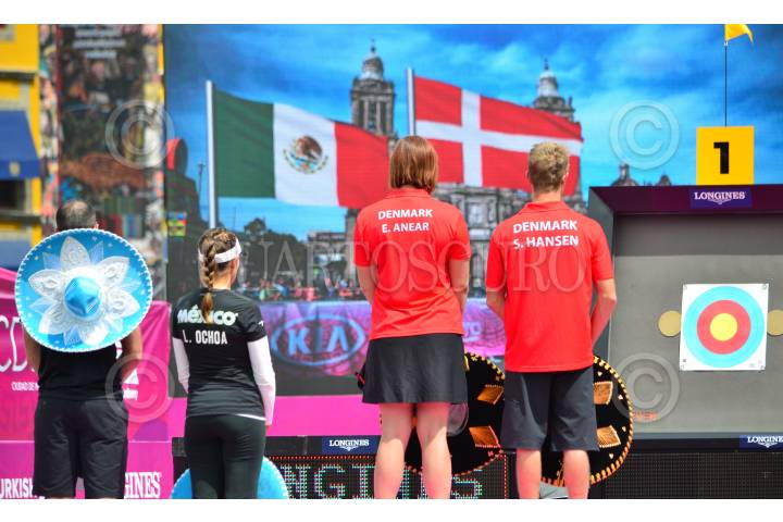 MÉXICO, D.F., 24OCTUBRE2015.- La pareja de Dinamarca obtuvo el primer lugar en contra de Mario Cardoso y Linda Ochoa, campeona mundial de Tiro con Arco, en el Tiro Combinado de Parejas en contra de Dinamarca, quienes ocuparon la primera posición. El torneo internacional transcurre en estos momentos en el Zócalo capitalino. FOTO: MARÍA JOSÉ MARTÍNEZ /CUARTOSCURO.COM