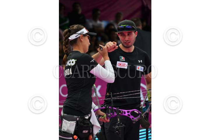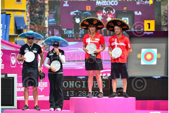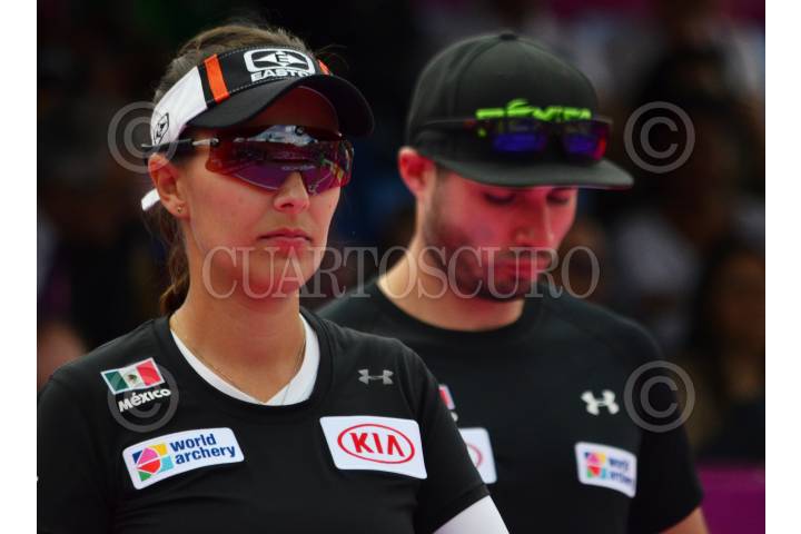 MÉXICO, D.F., 24OCTUBRE2015.- Mario Cardoso y Linda Ochoa, campeona mundial de Tiro con Arco, quedaron en segundo lugar en el Tiro Combinado de Parejas en contra de Dinamarca, quienes ocuparon la primera posición. El torneo internacional transcurre en estos momentos en el Zócalo capitalino. FOTO: MARÍA JOSÉ MARTÍNEZ /CUARTOSCURO.COM