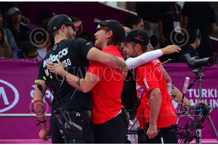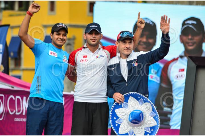 MÉXICO, D.F., 23OCTBRE2015.- En la imagen, Abhishek Verma, de India, segundo lugar; Demir Emaagacli, de Turquía, primer lugar, y el francés Dominique Genet, tercer lugar, en la Copa Mundial de Tiro con Arco 2015. Mañana se realizará la última etapa en el Zócalo capitalino. FOTO: MARÍA JOSÉ MARTÍNEZ /CUARTOSCURO.COM