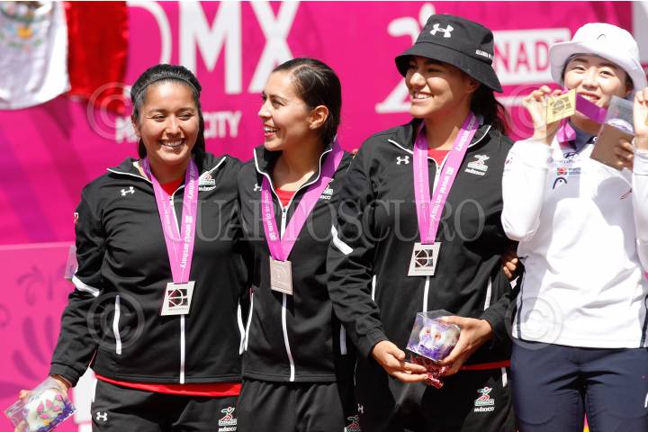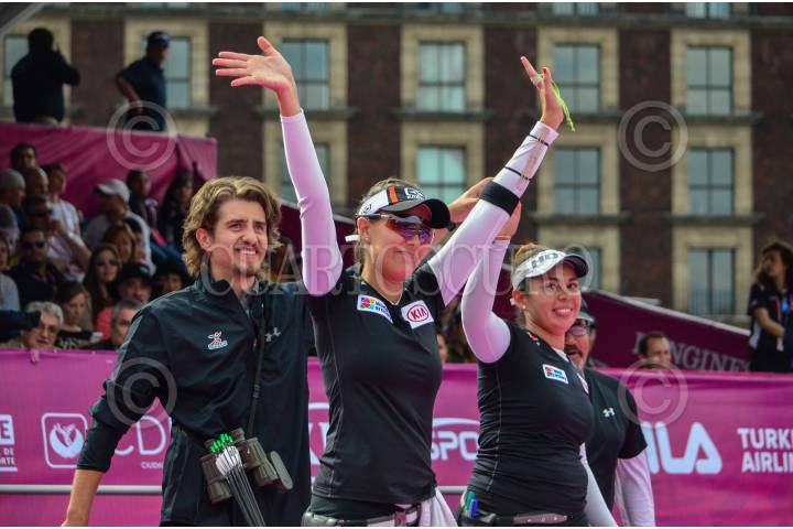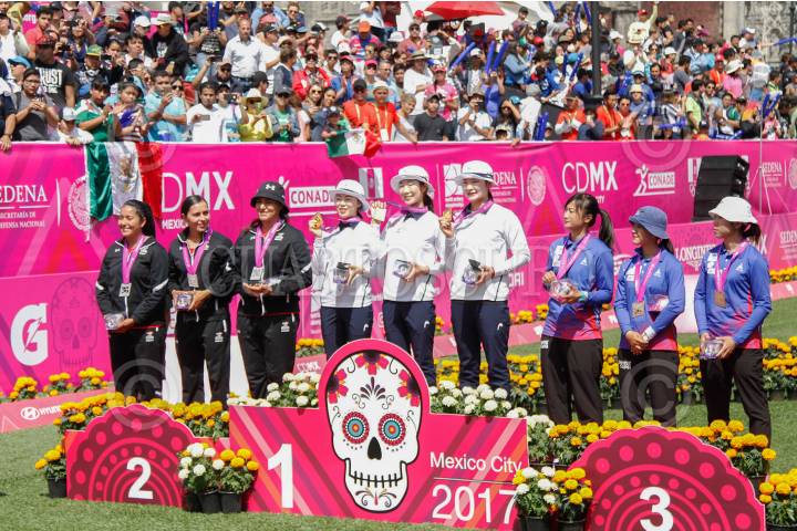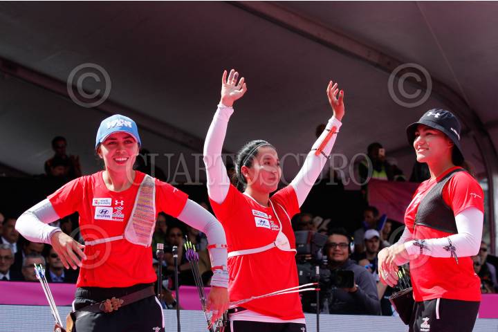CIUDAD DE MÉXICO, 22OCTUBRE2017.- Las arqueras mexicanas Aída Román, Mariana Avitia y Alejandra Valencia, obtuvieron la medalla de plata en el Campeonato Mundial de Tiro con Arco llevado a cabo en la plancha del Zócalo. FOTO: CUARTOSCURO.COM