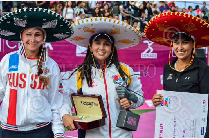 MÉXICO, D.F., 23OCTBRE2015.- En la imagen, Mariia Vinogradova, de Rusia, quien obtuvo el segundo lugar, Sara López, primer lugar, y Linda Ochoa, quien consiguió calificar a la final y obtuvo el tercer lugar y bronce en la Copa Mundial de Tiro con Arco 2015. Mañana se realizará la última etapa en el Zócalo capitalino. FOTO: MARÍA JOSÉ MARTÍNEZ /CUARTOSCURO.COM