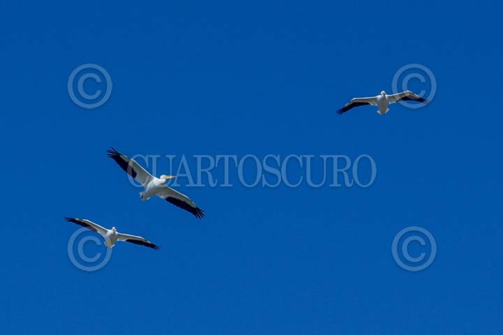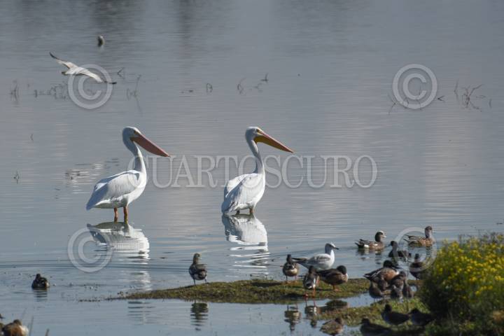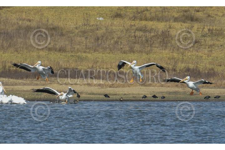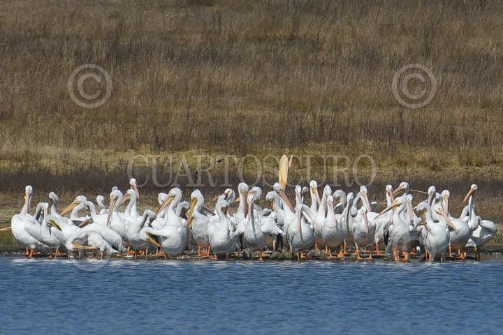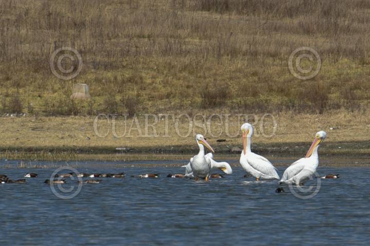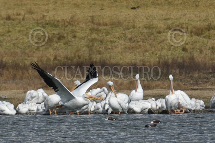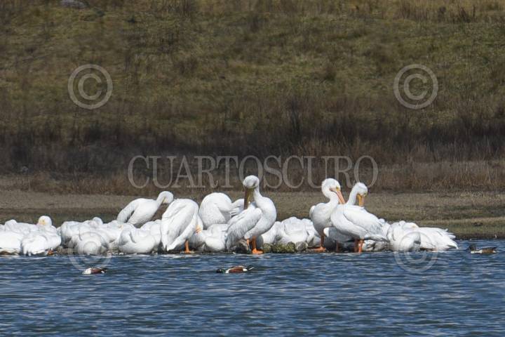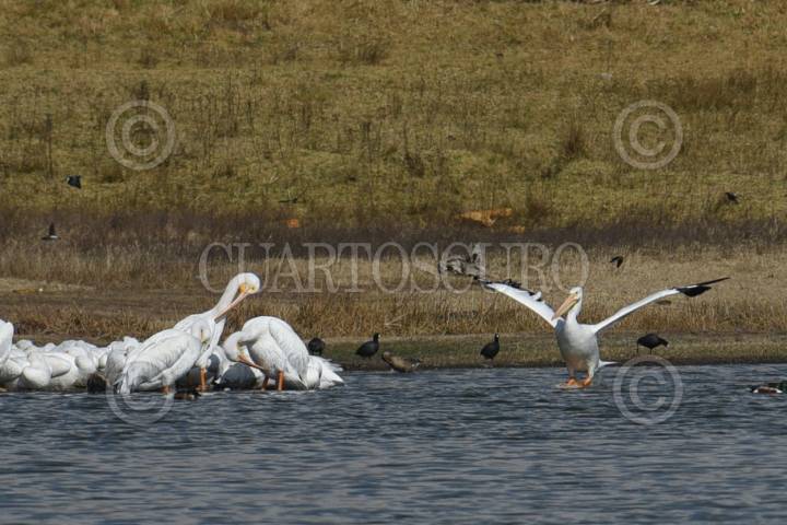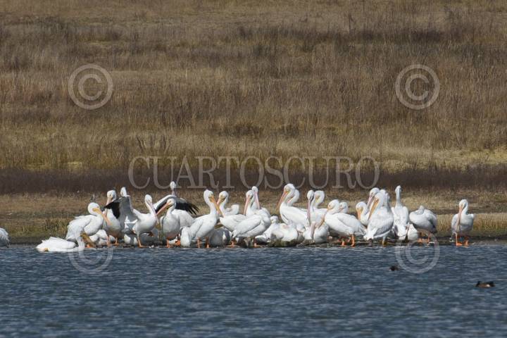 Una parvada de pelícanos blancos americanos se encuentra pasando el invierno en el bordo de San Jerónimo en la delegación toluqueña de Tlachaloya Primera Sección.