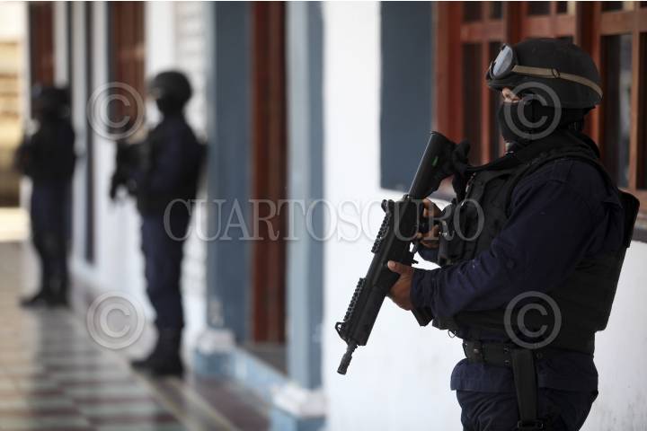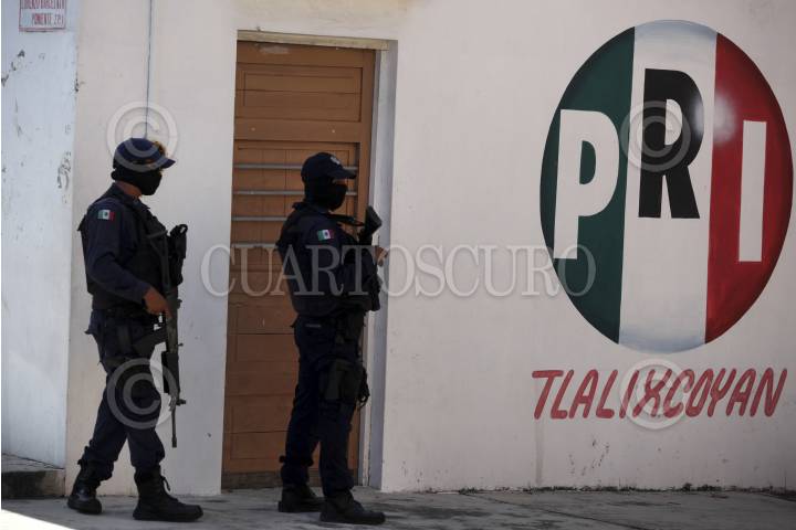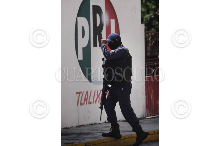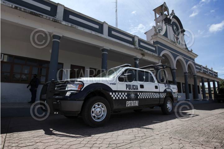 TLALIXCOYAN, VERACRUZ, 04JULIO2013.- Elementos de la Policía Estatal resguardan las instalaciones del palacio municipal de Tlalixcoyan luego de una serie de acontecimientos que la autoridad aún no lo aclara de manera oficial. En el lugar se encuentran retenidos por la Policía Estatal un grupo de uniformados municipales, así mismo, se reporta la desaparición de dos militantes panistas en la región. Durante todo la semana se ha informado de ataques armados como el del pasado 1 de Julio cuando un grupo armado baleó la casa del candidato del PAN, Carlos Triana García. FOTO: FÉLIX MÁRQUEZ /CUARTOSCURO.COM