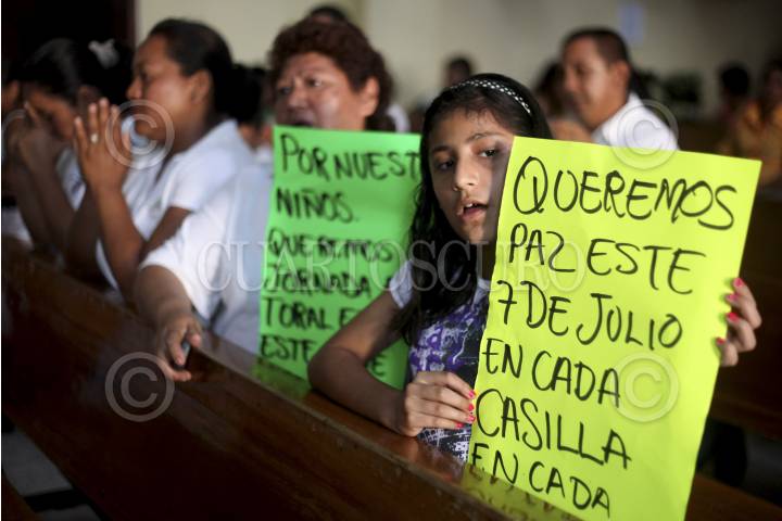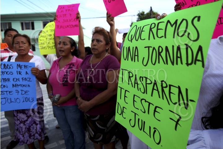 TLALIXCOYAN, VERACRUZ, 04JULIO2013.- Ciudadanos de la comunidad de Piedras Negras, así como familiares de los policías municipales y militantes panistas retenidos por la Policía Estatal este día, salieron a las calles para exigir un proceso electoral en paz este próximo 7 de Julio. Posteriormente ingresaron a la iglesia del pueblo para orar por las personas retenidas que hasta el momento no han sido presentadas por las autoridades. FOTO: FÉLIX MÁRQUEZ /CUARTOSCURO.COM