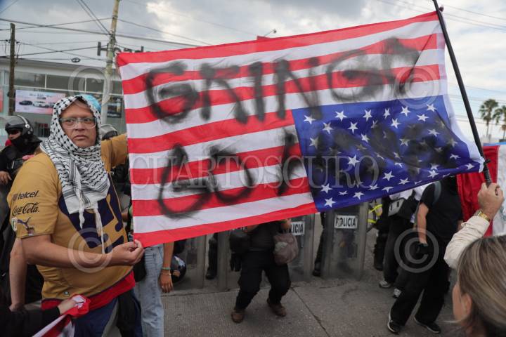 CIUDAD DE MÉXICO, 20JULIO2025. Segunda manifestación contra la gentrificación en la Ciudad de México. El contingente partió de la estación de metrobús Fuentes Brotantes rumbo a la estación El Caminero. En la imagen protestantes muestran una bandera de Estados Unidos con el mensaje "Gringo go home". FOTO: EDGAR NEGRETE LIRA/CUARTOSCURO.COM