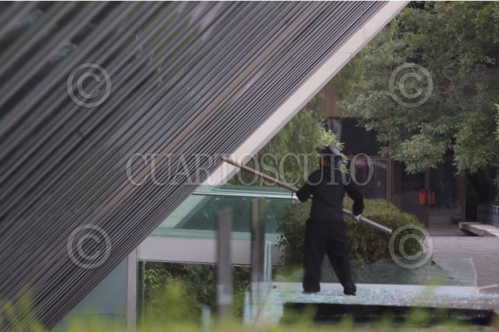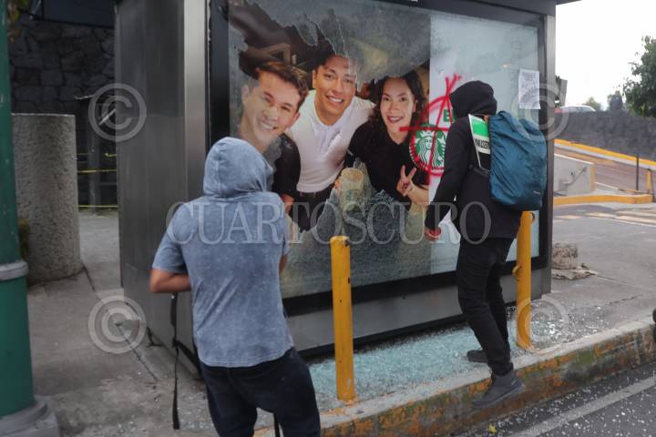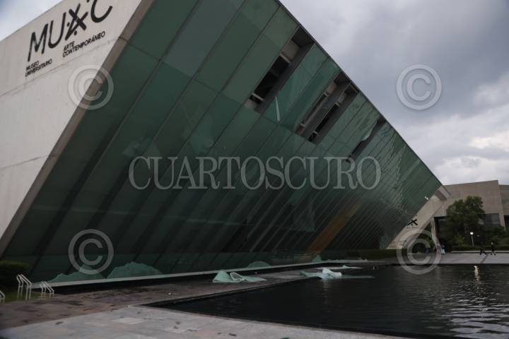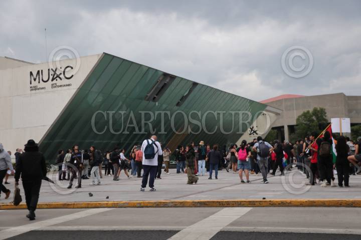 CIUDAD DE MÉXICO, 20JULIO2025.– Varios vidrios del Museo Universitario de Arte Contemporáneo (MUAC) fueron rotos al llegar el contingente de la segunda marcha contra la gentrificación en la Ciudad de México. El contingente, que partió de la estación de Metrobús Fuentes Brotantes rumbo a la estación El Caminero, regresó por avenida Insurgentes hasta ingresar a Ciudad Universitaria. FOTO: EDGAR NEGRETE LIRA/CUARTOSCURO.COM