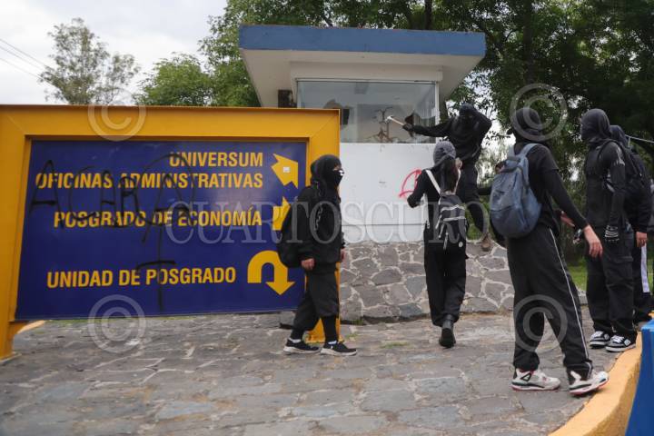 CIUDAD DE MÉXICO, 20JULIO2025. Un grupo de encapuchados realizó pintas y rompieron vidrios a su entrada a CU durante la segunda marcha contra la gentrificación en la Ciudad de México. FOTO: EDGAR NEGRETE LIRA/CUARTOSCURO.COM