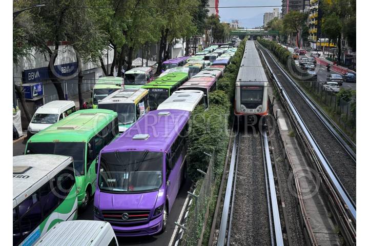 CIUDAD DE MÉXICO, 29JULIO2025.- Decenas de personas de la Fuerza Amplia de Transportistas, mantienen cierre a la altura de Calzada de Tlalpan y San Antonio Abad con el fin de marchar rumbo al Zócalo. En la imagen vista de las unidades detenidas a un costado del Metro. FOTO: ANDREA MURCIA /CUARTOSCURO.COM