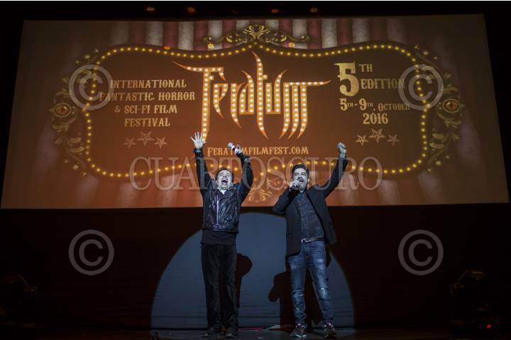 TLALPUJAHUA, MICHOACÁN, 09OCTUBRE2016.- 40 largometrajes de terror, sci-fi y fantasía fueron proyectados en la quinta edición del Feratum Film Fest. El acto de clausura se realizó en el teatro Cenobio Paniagua, con una nueva propuesta circense del circo Atayde Hermanos y dónde fue homenajeada Rosa Gloria Chagoyan "Lola la Trailera" y el cineasta Alfredo Gurrola. En la imagen el director general del festival, Miguel Marín (der). FOTO: ALAN ORTEGA /CUARTOSCURO.COM
