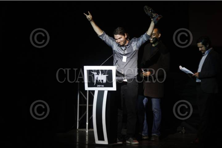 TLALPUJAHUA, MICHOACÁN, 09OCTUBRE2016.- 40 largometrajes de terror, sci-fi y fantasía fueron proyectados en la quinta edición del Feratum Film Fest. El acto de clausura se realizó en el teatro Cenobio Paniagua, con una nueva propuesta circense del circo Atayde Hermanos y dónde fue homenajeada Rosa Gloria Chagoyan "Lola la Trailera" y el cineasta Alfredo Gurrola. En la imagen el director Edgar Nito celebra con el el Premio Nosferatu de bronce, por "Masacre en San José", corto que obtuvo la presea Alucarda en Mejor Director, Mejor Actor, Mejores Efectos Visuales y Música Original. FOTO: ALAN ORTEGA /CUARTOSCURO.COM
