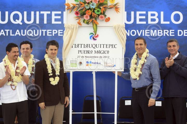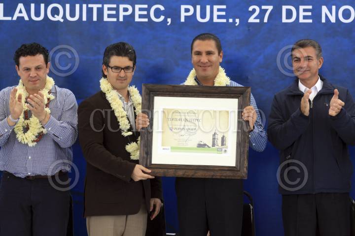 TLATLAUQUITEPEC, PUEBLA, 27NOVIEMBRE2012.- El gobernador de Puebla Rafael Moreno Valle, acompañado por el presidente municipal de Tlatlauquitepec, Porfirio Loaeza recibieron de manos de Luis Alfonso Lugo Platt, subsecretario de operación turística; el nombramiento de "Pueblo Mágico", siendo así el sexto en ocupar este título dentro del estado de Puebla. FOTO: HILDA RÍOS /CUARTOSCURO.COM