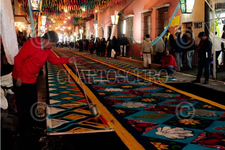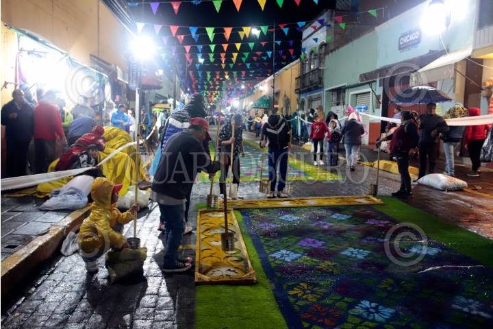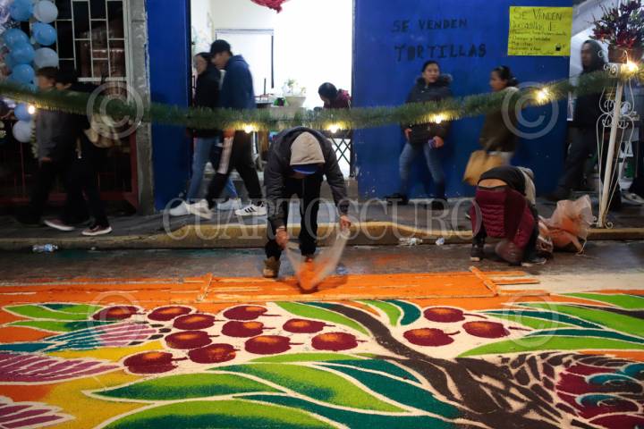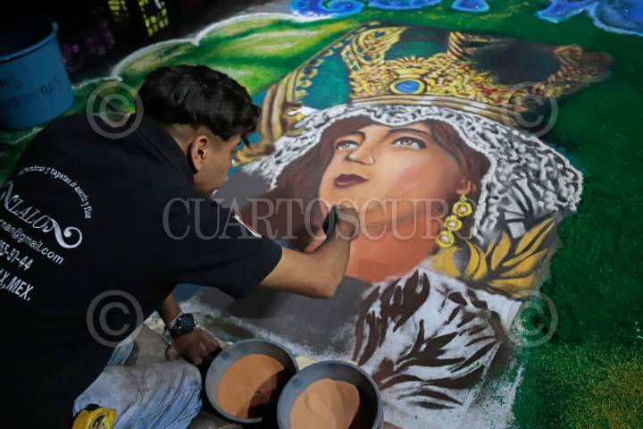 HUAMANTLA, TLAXCALA, 15AGOSTO2025.- Los tapetes monumentales de aserrín son el elemento central de "La Noche que Nadie Duerme", una tradición que se celebra cada 14 de agosto, que celebra a la Virgen de la Caridad. Estas alfombras son elaboradas a mano con aserrín teñido, flores y otros materiales naturales a fin de cubrir decenas de kilómetros de las calles por donde pasa la procesión. Su elaboración puede tardar hasta 12 horas y participan familias, colectivos y artistas locales. FOTO: MIREYA NOVO/CUARTOSCURO.COM