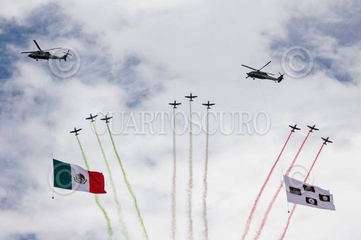 ATLANGATEPEC, TLAXCALA, 12SEPTIEMBRE2025.- Aeronaves realizan una formación Flor de Liz durante el ensayo de la Parada Aérea Militar con motivo del desfile alusivo al 215 aniversario del inicio de la Guerra de Independencia de México. El acto se realizó en las inmediaciones de la Estación Aérea Militar No. 9 de la SEDENA. FOTO: GALO CAÑAS/CUARTOSCURO.COM