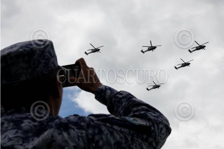 ATLANGATEPEC, TLAXCALA, 12SEPTIEMBRE2025.- Un militar graba el paso de helicópteros de las Fuerzas Armadas durante el ensayo de la Parada Aérea Militar con motivo del desfile alusivo al 215 aniversario del inicio de la Guerra de Independencia de México. El acto se realizó en las inmediaciones de la Estación Aérea Militar No. 9 de la SEDENA. FOTO: GALO CAÑAS/CUARTOSCURO.COM