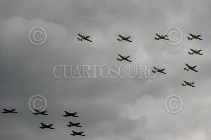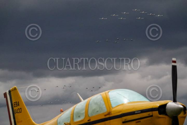 ATLANGATEPEC, TLAXCALA, 12SEPTIEMBRE2025.- Aeronaves vuelan en formación durante el ensayo de la Parada Aérea Militar con motivo del desfile alusivo al 215 aniversario del inicio de la Guerra de Independencia de México. El acto se realizó en las inmediaciones de la Estación Aérea Militar No. 9 de la SEDENA. FOTO: GALO CAÑAS/CUARTOSCURO.COM