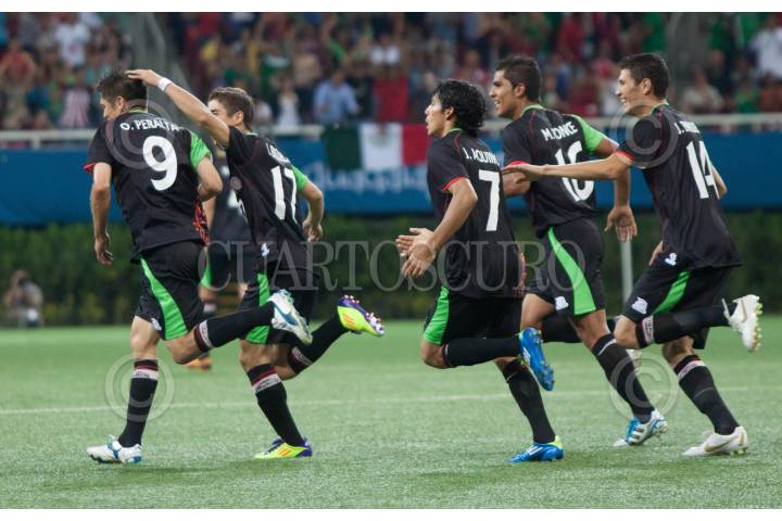 GUADALAJARA, JALISCO, 21OCTUBRE2011.- La selección mexicana de fútbol se enfrenta a su similar de Trinidad y Tobago en los Juegos Panamericanos Guadalajara 2011 donde al medio tiempo van empatados a un gol. Oribe Peralta festeja el gol del empate con el equipo. FOTO: IVÁN STEPHENS/CUARTOSCURO.COM